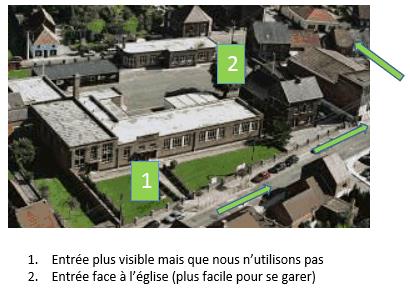 (Nous conseillons aux personnes qui arrivent par la rue principale de continuer tout droit et en face du Home/Hôpital de tourner pour se garer en face de l’église. La vous serez en face de l’entrée 2.)